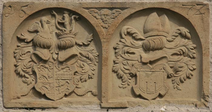 Abb.: Allianzwappen an der Westseite des Marstalls. Bestes Photolicht am Nachmittag. Beide Wappen sind als Vollwappen im Stil der Renaissance dargestellt.