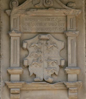 Auch die Nebengebäude sind wappengeschmückt. Dieses hier (Abb. folgend) ist namentlich Graf Ludwig Kasimir zugeordnet und auf 1564 datiert. Eine weitere Inschrift direkt darunter datiert vom 5.9.1667.