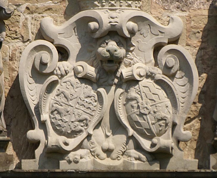 An dem Schloß befinden sich viele Wappensteine. Das Bildprogramm ist meistens inhaltlich identisch. Der nachfolgend abgebildete Wappenstein befindet sich am Nordeingang des Schlosses.