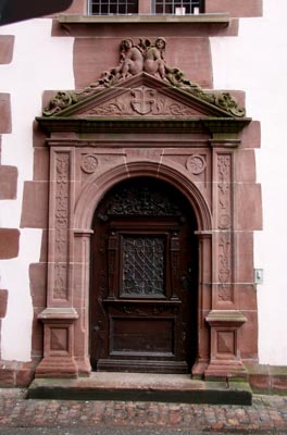 Dieses Portal befindet sich an der Nordseite des Neuen Rathauses. Es ist rechts oben mit dem Namen "Haid" und einem Steinmetzzeichen versehen. Im Dreiecksgiebel befindet sich das Freiburger Stadtwappen, es zeigt in Silber ein durchgehendes rotes Kreuz, wie das alte Hochstiftswappen, das jedoch nicht vor dem 14. Jh. auftaucht. Es ist das selbe Zeichen, mit dem als Banner der Hl. Georg traditionell dargestellt wird, und so findet man es häufig bei Städten, deren Schutzpatron dieser ist, wie bei Freiburg und z. B. auch bei London.