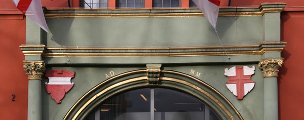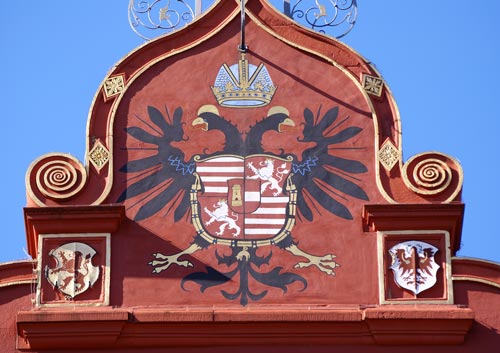 Die Fassade war früher immer gänzlich bemalt, wenn auch nacheinander in gänzlich unterschiedlichen Fassungen, aber nach dem kriegszerstörungsbedingten Wiederaufbau 1952-1954 hat man die Farbfassung schlichter und einheitlich sandsteinrot gewählt, so daß der heraldische Schmuck, der den Herrschaftsverhältnissen des 16. Jh. entspricht, ganz im Vordergrund steht. Der Giebel ist mit Elementen des österreichischen Wappens geschmückt. Im Zentrum des obersten Giebelfeldes unterhalb des Glockenaufsatzes befindet sich das österreichische Wappen, von einer Collane des Ordens vom Goldenen Vlies umgeben und einem golden nimbierten und ebenso bewehrten schwarzen Doppeladler aufgelegt, über dem die Kaiserkrone schwebt.