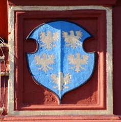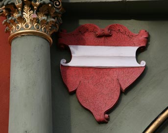 Details vom Giebel: Abb. links: in Rot ein silberner Balken, Erzherzogtum Österreich. Abb. Mitte: in Silber ein golden bekrönter (fehlt hier) und ebenso bewehrter roter Adler mit goldenen Kleestengeln, gefürstete Grafschaft Tirol, hier um den Kopf zwei grüne Lorbeerzweige. Abb rechts: in Rot ein goldener Schrägrechtsbalken, begleitet oben und unten von drei 1:2 bzw. 2:1 nach der Figur gestellten goldenen Kronen, die unteren gestürzt, Oberelsaß, Landgrafschaft Elsaß. Die Grafen von Habsburg hatten die Landgrafschaft im Oberelsaß seit dem 11. Jh. inne, wo sie u. a. Gründer von Ottmarsheim waren.