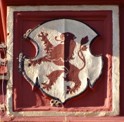 Details vom Giebel: Abb. links: in Gold ein eigentlich blau gekrönter (fehlt hier) und ebenso bewehrter (fehlt hier) roter Löwe, Grafschaft Habsburg. Abb. Mitte: in Blau fünf (2:2:1) goldene Adler, Niederösterreich, Erzherzogtum Österreich unter der Enns. Abb rechts: Stadtwappen von Freiburg, in Silber ein durchgehendes rotes Kreuz.