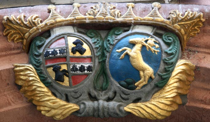 Der heraldisch rechte Schild zeigt das Wappen der Bayer (Beyer). Das Stammwappen der Bayer ist rot mit einem mit drei schwarzen Bienen belegten silbernen Balken. 1559 kam es zur ersten Wappenvermehrung: Feld 1 und 4: Stammwappen, Feld 2 und 3 in Gold ein vorderhalber schwarzer Hammel (Haimbl). Diese zweite Komponente ist das Wappen der Haimbl, denn Georg Bayer, erzfürstbischöflicher Rat und geheimer Sekretär in Innsbruck, Vater des für Freiburg relevanten Johann Stephan Bayer, hatte in zweiter Ehe Anna Maria Haimbl (Haimblin) geehelicht, und er durfte das Stammwappen mit landesherrlicher Bestätigung um diese Komponente vermehren. In dieser Form sehen wir es hier am Portal, allerdings mit einem Versatz: Der Bildhauer hat aus künstlerischen Gründen gemogelt, indem er die untere Feldgrenze von Feld 1 an die obere Balkengrenze von Feld 4 stoßen läßt und die obere Feldgrenze von Feld 4 an die untere Balkengrenze von Feld 1. So wird zwar unmerklich gemogelt, aber die Platzverteilung in der ovalen Kartusche wird besser, weil beide Balken dadurch mehr Breite bekommen und die Bienen besser dargestellt werden können.