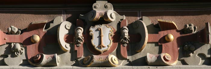Aus der Zeit der Nutzung durch das Domkapitel und ihren Umbauten um 1590 stammt das herrliche Renaissance-Portal (im oberen Bild sind die seitlichen ionischen Pilaster mit Beschlagwerkfüllung auf löwenkopfgeschmückten Sockeln zu sehen) mit dem Wappen des Baseler Hochstifts, dem roten Baselstab auf silbernem Feld, inmitten von Rollwerk.