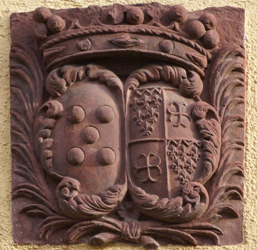 Das Wappen der Freiherren von Sickingen zeigt in Schwarz fünf (2:1:2) silberne Kugeln (hier ohne sichtbare Bordierung des Schildes). Das Wappen der Kämmerer von Worms, genannt von Dalberg ist geviert. Feld 1 und 4: unter einem mit drei Spitzen abgeteilten goldenen Schildhaupt in Blau 6 (3:2:1) silberne Lilien (Kämmerer von Worms), Feld 2 und 3: in Gold ein schwarzes Ankerkreuz (Dalberg). Über beiden unten von Palmzweigen eingefaßten barocken Schilden ruht eine Krone.