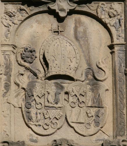 Der zweite große Wappenstein befindet sich an der ansonsten fensterlosen südlichen Stirnwand des Westflügels. Hinter dieser Mauer befindet sich die Kapelle, die durch je zwei Fenster in der West- und in der Ostwand Licht bekommt. Stilistisch ähnelt der Wappenstein sehr dem oben besprochenen, vermutlich wurde er sogar vom selben Künstler angefertigt, ähnlich ist der opulente Rahmen mit Putten und Fruchtgebinden, gleichfalls ist über der Wappenzone ein Medaillon mit einer Darstellung eines Petruskopfes zwischen den beiden je einen Thyrsosstab (Fruchtbarkeitssymbol, in der antiken Mythologie dem Dionysos-Kult zuzurechnen) haltenden Putten, und unter der Wappenzone ist Raum für zwei - nicht mehr erhaltene oder nicht ausgeführte - Inschriften. Eine rechteckige Scheinarchitektur mit einem Rundbogen auf zentralperspektivisch dargestellten Pfeilern rahmt die Wappenkombination aus zwei Schilden, hinter denen der Abtsstab mit abflatterndem Sudarium schräggestellt ist. In den Bogenzwickeln sind zwei geflügelte Engelsköpfe zu sehen.