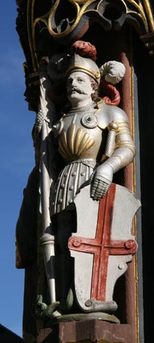 Der Figurenschmuck ist in zwei Ebenen übereinander gestaffelt, wobei die obere Ebene gegenüber der unteren um 45° verdreht ist, so daß die oberen Figuren zwischen den Baldachinen der unteren Figuren zu stehen kommen, eine sehr reizvolle Komposition (Abb. Mitte). Von heraldischem Interesse ist hier vor allem der Stadtpatron St. Georg (Abb. rechts), ein Geharnischter mit einer mächtigen Lanze in der Rechten, die er auf dem Sockel abstützt. In der Hand hält er einen langen und schmalen Schild mit dem Stadtwappen von Freiburg, in Silber ein durchgehendes rotes Kreuz. Ihm gegenüber steht ein zweiter Geharnischter (Abb. links), der in der Rechten zusammen mit einem Schwert den Bindenschild des Erzherzogtums Österreich hält. Dieser stellt den Hl. Leopold III. dar. Er ist der Schutzpatron Österreichs (1663 von Leopold I dazu erhoben) und damit auch Vorderösterreichs mit dem Breisgau. Leopold III, der Heilige, der Fromme oder auch der Milde genannt, lebte von 1073 bis 1136, entstammte als Sohn von Markgraf Leopold II dem Haus der Babenberger und war 1095-1136 Markgraf der bayerischen Ostmark und Landesherr von Österreich. Er leistete wichtige Beiträge zur Etablierung klösterlicher Kultur in Österreich, so gehen die beiden Klöster Heiligenkreuz und Klosterneuburg auf seine Stiftungen zurück. Zeitweise war er sogar als Königskandidat im Gespräch, es wurde aber dann nach einigen Verwicklungen jemand aus dem Haus der Staufer.