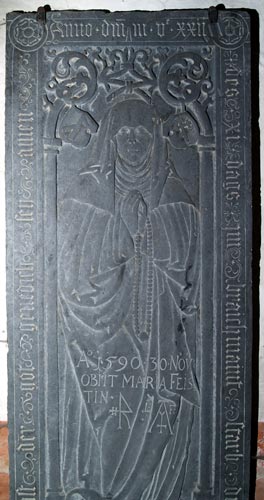 Im Halbdunkel des nördlichen Seitenschiffes ist turmnah an der Nordwand eine Grabplatte angebracht für Katharina Feyst. Sie ist fast anthrazit-schwarz und aus Schiefer gearbeitet. Für dieses Material ist sie von erstaunlicher Feinheit und Qualität. Die zwischen Rosetten in den Ecken umlaufende Inschrift lautet "Anno d(o)m(ini) m vc xx ii des xi tags im braichmaint starb dye e(h)rsame catharina feyst der got(t) genedich sey amen." Zwei Details sind bemerkenswert; für die Zahl 500 wird hier nicht das allgemein übliche "D" verwendet , sondern "v" für 5 und ein hochgesetztes "c" für hundert. Die Jahreszahl 1552 wird auf dem kleinen Podest zu Füßen der Verstorbenen in arabischen Ziffern bestätigt. Das andere Detail ist die Monatsangabe "braichmaint" - der Brachmonat entspricht dem sechsten Monat, dem Juni. Warum "Brach..."? Das geht zurück auf die alte Dreifelderwirtschaft, denn im Juni begann man mit der Bearbeitung der Brache.