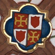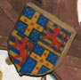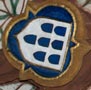 Dieses Wappen, welches an zwei Schlußsteinen auftaucht, steht für Louise / Lucie de Bellenhausen, Tochter von Oswald de Bellenhausen und Agnès d'Ellenz. Der Schild zeigt in Silber sieben (3:3:1) blaue Schildchen. Die Helmzier wäre ein beiderseits wie der Schild bezeichneter offener Flug, alternativ der Schild zwischen einem silbernen Paar Büffelhörner. Helmdecke blau-silbern. Französischer Blason: D'argent à 7 écussons d'azur posés 3:3:1. Cimier un vol aux armes ou un écusson aux armes entre deux proboscides d'argent. Im Gruber wird dieses Wappen mit 6 (3:2:1) Schildchen geführt. | |