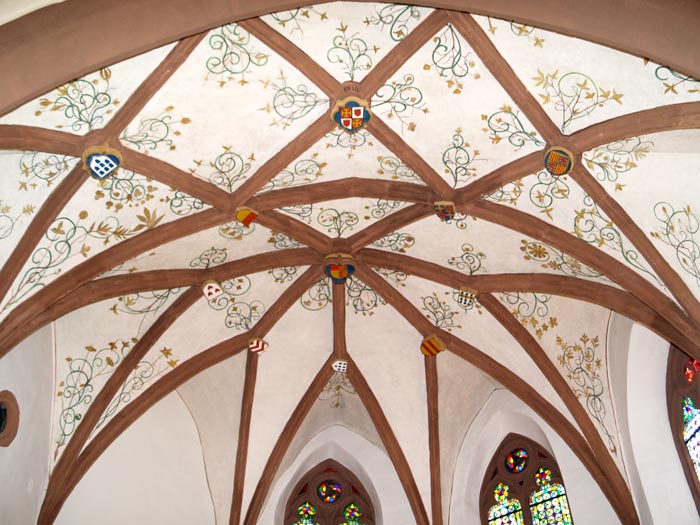 Die Schlußsteine des Rippengewölbes im Langhaus erstrahlen nach der 2010 durchgeführten Restaurierung wieder in neuer Farbfassung. Die einzelnen Joche greifen dabei das heraldisch-genealogische Programm auf, das uns bereits bei den einzelnen Epitaphien begegnet ist.