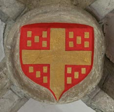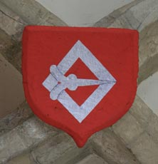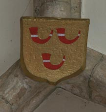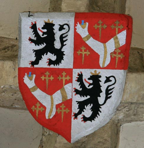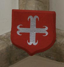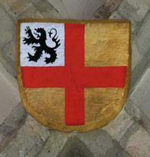 Abb. links: Wappen der Herren von Septfontaines, in Rot ein silbernes Ankerkreuz (frz. de gueules à la croix ancrée dargent). Die hier nicht verwendete Helmzier wäre ein Paar Büffelhörner (deux cornes ou proboscides). Thomas de Septfontaines hatte Irmengarde de Cranendonck geheiratet, und diese beiden gelten als die Gründer des 1317 geweihten Kirchengebäudes. Dieses Wappen der im 14. Jh. schon ausgestorbenen Ortsherren lebt übrigens im heutigen Kommunalwappen fort: Dieses zeigt in Rot ein silbernes Ankerkreuz, dieses belegt mit einem roten Zinnenturm (frz. de gueules à la croix ancrée dargent chargée en ceur dune tour crénelée de gueules).