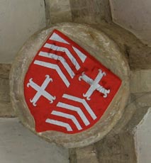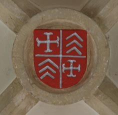 Abb. links: Wappen aus dem Hauptschiff-Gewölbe, Wappen der Edlen Herren von Rollingen-Siebenborn, de Raville-Siebenborn, vermehrtes Wappen wie oben beschrieben.
