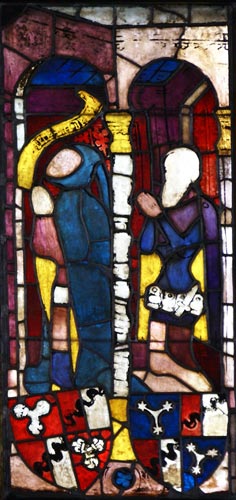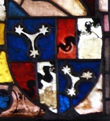 Links daneben (obere Ausschnittsvergrößerung) ist eine weitere Stifterfigur, deren Wappen ebenfalls geviert ist mit dem Behaim-Wappen in den Feldern 1 und 4, in Feld 2 in Rot zwei mit dem Rücken gegeneinander gekehrte, silberne, goldengegriffte Sicheln (von Grauberg), in Feld 3 in Gold ein roter Sparren (Vorchtel). Hierbei werden zwei Brüder zusammengefaßt: Heinrich Behaim, gest. 1423, hatte eine Vorchtel geheiratet, und Peter Behaim (1356-1414) hatte eine von Grauberg geheiratet. Berthold, Heinrich und Peter waren die Söhne von Albrecht IV. Behaim (1288-1359, im Fleischmann Albrecht VI.), dem jüngeren Bruder Friedrichs II. Behaim. Damit sind die drei Stifter optisch unten links Vettern ersten Grades in Bezug auf die Fensterstifter Herdegen und Friedrich III.