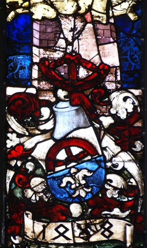 Die Bilder zeigen die beiden zentralen Vollwappen der unteren Reihe. Das optisch rechte Wappen trägt die Datierung des Fensters: 1488. Beide stellen das Volckamer-Wappen dar, von Silber und Blau geteilt, oben ein oberhalbes rotes Rad mit drei Speichen, unten eine silberne Lilie. Auf dem Helm mit rot-silbernen Decken ein unterhalbes rotes Rad mit drei Speichen, oben mit einem schwarzen Hahnenfederbusch besteckt. Das Wappen wird beschrieben im Siebmacher Band: Bay Seite: 121 Tafel: 149, sowie im Schöler Tafel 129. 1433 gab es lt. Siebmacher eine Wappenbesserung von Kaiser Sigmund, auf dem Stechhelm durfte eine goldene Helmkrone geführt werden. So wird das Wappen im Alten Siebmacher von 1605 abgebildet. Diese Darstellungen im Fenster von 1488 sind jedoch ohne eine solche.
