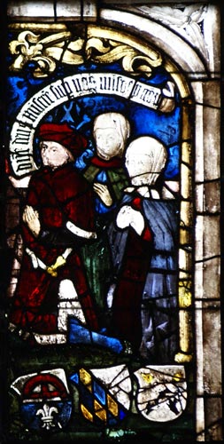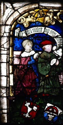 Peter III. (1431-1493), Ratsherr und zweimal jüngerer Bürgermeister, hatte Apollonia Mendel geheiratet. Neben Peter sind seine Söhne Nikolaus und Sebald dargestellt, genauso wie auf dem ebenfalls von ihm gestifteten, berühmteren Fenster in St. Lorenz. Da die Söhne ber nicht überlebten, wurde Paul der Stammvater aller nachfolgenden Volckamer.