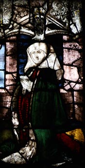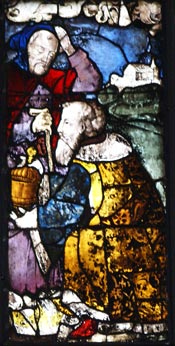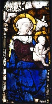 Einzelne Scheiben aus der dritten und vierten Reihe von unten. Die linken drei Scheiben stammen aus der vierten Reihe und stellen die Anbetung der Heiligen drei Könige dar, das vierte Bild ist aus der dritten Reihe und entstammt der Beschneidungsszene. Die meisten Scheiben des Fensters wirken unstimmig durch Trübungen und krassem Hell-Dunkel-Wechsel und sind vor allem durch den Austausch fast aller Köpfe im 19. Jh. beeinträchtigt.