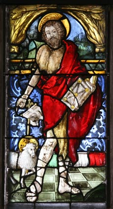 In der Mitte zwischen beiden Wappenfenstern sieht man Jesus auf einem perspektivisch dargestellten Fliesenfußboden, neben ihm das Lamm Gottes, ein Hinweis auf die Passionsgeschichte, die uns im gegenüberliegenden Fenster begegnet.