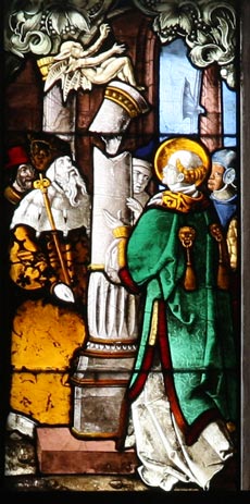 Szenen aus der Laurentius-Legende: Linkes Feld: Abschied des durchgängig in eine grüne Dalmatika gekleideten Laurentius von Rom von Papst Sixtus II, an der Tiara und dem Vortragekreuz zu erkennen. Hier wird die prunkvolle zeitgenössische Kleidung auf historische Ereignisse projiziert, tatsächlich mußte Papst Sixtus II. während der Christenverfolgungen in den Untergrund gehen und seinen Beruf in den Katakomben ausüben. Laurentius war Archidiakon des Papstes. Der Kaiser Roms, Valerian, ließ Papst Sixtus II. enthaupten und wollte sein Vermögen einziehen. Mittleres Feld: Den Armen von Rom spendet der Heilige Almosen. Er war für die Verwaltung des Kirchenvermögens zuständig und widersetzte sich der kaiserlichen Aufforderung zur Herausgabe des Vermögens durch Verteilung an die Gemeinde, denn die Menschen derselben seien der wahre Reichtum. Der unmittelbare Zusammenhang mit der ersten Szene wird durch die beide Scheiben verbindende Girlande deutlich gemacht, auf der ein Affe schaukelt. Der Affe, als Symbol des Lachhaften eingesetzt, könnte sich auf die Unüberlegtheit der Almosenspende beziehen, die einfach die Rache des Kaisers heraufbeschwören mußte. Rechtes Feld: Zerstörung eines Götzenbildes allein durch die Kraft des Gebetes, die Säule zerbirst, und das teufelsähnliche Götzenbild fällt herab. Links steht der Kaiser und erkennt, wie gefährlich der Heilige für ihn wirklich ist.