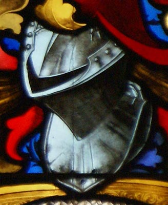 Abb. rechts: 3. Reihe des Fensters, 4. Scheibe von links: Noch ein Wappen der Familie Oertel, dieses Mal in normaler Stellung. Das Beiwappen verweist auf die Familie Gruber, in golden-blau gespaltenem Schild ein Sparren in verwechselten Farben, vermutlich aber hier gewendet dargestellt (Schöler Tafel 23). Die um 1500/10 in der Hirsvogel-Werkstatt entstandene Scheibe befand sich ehemals im ersten, westlichsten Fenster des südlichen Seitenschiffs der Spitalkirche.