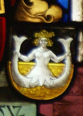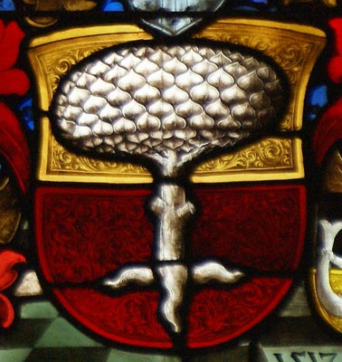 Abb. rechts: 3. Reihe des Fensters, Scheibe ganz rechts: Wappen genau wie zuvor beschrieben, aber dieses Mal in normaler Stellung und auch auf 1504 datiert, also spiegelbildlich zum ersten Bild. Auch diese Scheibe stammt aus der Hirsvogel-Werkstatt. Diesmal verweist der Beischild auf die Familie Winter, er zeigt in blau-golden geteiltem Schild ein aufspringendes Einhorn in verwechselten Farben (Siebmacher Band: BayA3 Seite: 143 Tafel: 98). Die hier nicht abgebildete Helmzier wäre auf dem blau-golden bewulsteten Helm mit ebensolchen Decken ein goldenes Einhorn wachsend. Diese Konstellation paßt zu Michael VII. Behaim, geb. 9.7.1459, gest. 24.10.1511, Ratsherr und 1502-1511 Ratsbaumeister, vermählt mit Margareta Winter (gest. 1519), einer Tochter des Augsburger Kaufmanns Hans Winter. Er ist der Sohn des oben erwähnten Leonhard Behaim. Beide Beiwappen begegnen uns übrigens wieder in St. Sebald auf dem gemalten Behaim-Stammbaum.