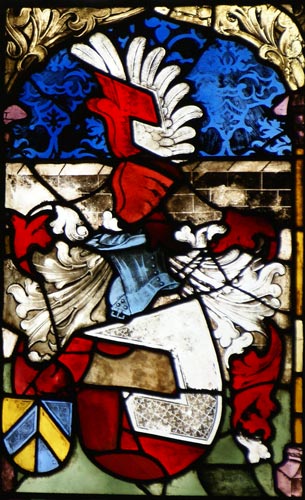 Abb. links: 3. Reihe des Fensters, 3. Scheibe von links: Wappen der Familie Oertel. Das ist ein ganz besonders harmonisches, einfaches und doch eingängiges Motiv, eine so in sich verzahnte Schildteilung, daß mit einer einzigen von Schildrand zu Schildrand gehenden Linie ein inverssymmetrisches Bild erzeugt wird. Das Wappen ist gewendet, also spiegelbildlich. Deswegen wird es blasoniert als silbern-rot mit eineinhalb Schrägzinnen schräggeteilt, oder als silbern-rot mit einer Gegenschrägzinne schräggeteilt, alternativ auch als silbern-rot mit zwei gegeneinandergekehrten Schrägzinnen schräggeteilt. Auf dem Helm mit rot-silbernen Decken ein geschlossener, beiderseits wie der Schild bez. Flug. Das Wappen wird beschrieben im Schöler, Tafel 18, und im Siebmacher Band: BayA1 Seite: 51 Tafel: 50. Mit dieser Schildteilung gibt es nur wenige Wappen, das seitenverkehrte Bild in den Farben Silber und Schwarz führen beispielsweise die v. Wendelstein aus Schwabach (Siebmacher Band: BayA1 Seite: 61 Tafel: 58). Der Beischild ist der der Familie Groß, in Silber auf einem goldenen Dreiberg ein aus einem roten Kreuz hervorwachsender grüner Lindenzweig (Lindenbaum), hier sehr stark ausgeblichen. Damit läßt sich diese Scheibe zuordnen, sie gehört vermutlich zu Sigmund Oertel (gest. 1525) und seiner Frau Margaretha Groß (gest. 1512), die zusammen 15 Kinder hatten, darunter einen Sohn Florentin. Die um 1500/10 wahrscheinlich in der Hirsvogel-Werkstatt entstandene Scheibe befand sich ehemals im ersten, westlichsten Fenster des südlichen Seitenschiffs der Spitalkirche.