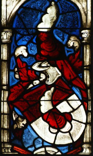 Hier wird der zweite Teil der Rechteck-Scheiben des sechsten (von Westen gezählt) Fensters im südlichen Langhaus-Seitenschiff vorgestellt, mit Scheiben aus der zweiten und der dritten Reihe. Im Bild sind die zweite und die dritte Reihe des Fensters, aus dem hier die obere Reihe komplett und das mittlere Paar der unteren Reihe einzeln vorgestellt werden.