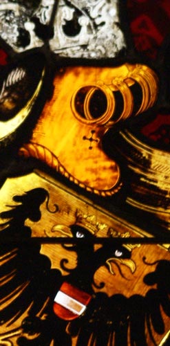 Unterste Reihe, 2. Scheibe von links: Der erste Schild zeigt in Rot (falsch, muß Silber sein) einen blauen Adler mit Brustspange (hier abweichend silbern, korrekt wäre rot-golden geschacht), Herzogtum Krain. 1278 kam die einst selbständige Grenzmark an Rudolf von Habsburg nach dessen Sieg auf dem Marchfeld. Als die Meinhardiner (Grafen von Görz) mit Heinrich von Kärnten 1335 ausstarben, konnte das Haus Habsburg Besitz ergreifen. 1364 wurde Krain zum Herzogtum, in zeitnahem Zusammenhang mit der Selbsterhebung der Herrscher von Österreich zu Erzherzögen. 1394 wurde es auch offiziell zum Herzogtum erhoben. Krain gehörte mit der Steiermark, Kärnten, Istrien, Görz und Triest zur Ländergruppe Innerösterreich. Der zweite Schild zeigt in Silber einen golden bewehrten, roten Adler, hier mit einer silbernen Spange, korrekterweise mit goldenen Kleestengeln, gefürstete Grafschaft Tirol. Unterste Reihe, Scheibe ganz links: Der erste Schild zeigt in Rot einen silbernen Balken für das Erzherzogtum Österreich, und der zweite Schild zeigt in Blau 5 (2:2:1) gestellte goldene Adler für Altösterreich, Niederösterreich. Ohne Abbildung: Unterste Reihe, 2. Scheibe von rechts, mit zwei weiteren Schilden habsburgischer Länder.