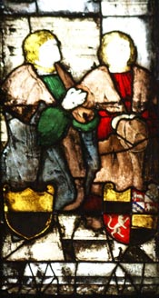 In der dritten Reihe von unten sehen wir zwei Vollwappen, links das Wappen der Pfinzing, das eigentlich das durch die Heirat von Friedrich Pfinzing, dem Begründer der Hauptlinie, gest. vor 1331, mit Elisabeth Geuschmid ererbte Wappen der Geuschmid ist, von Gold und Schwarz geteilt, auf dem schwarz-golden bewulsteten Helm mit ebensolchen Decken ein golden-schwarz geteiltes Paar Büffelhörner, rechts das Wappen der Grundherr, in Rot ein oberhalber, golden gekrönter, silberner Löwen, auf dem rot-silbern bewulsteten Helm mit ebensolchen Decken der silberne, golden gekrönte Löwe wachsend. Diese Kombination paßt zu den Eltern des Stifters. Der Stifter war Melchior Pfinzing (1481-1535), seit 1514 kaiserlicher Rat und 1512-1521 Propst zu St. Sebald, unvermählt. Seine Vater war der Ratsbaumeister Seifried III. (Siegfried) Pfinzing (1444-7.9.1514), der in erster Ehe 1475 mit Kunigunde Mendel (-1476) verheiratet war, ein Jahr später schon Witwer wurde und in zweiter Ehe 1477 Barbara Grundherr (1457-1517) ehelichte, die einzige Tochter des Ratsherrn Ulrich II. Grundherr und dessen Frau Anna Haller. Der 1481 geborene Melchior war also ein Sohn aus zweiter Ehe, und hier sind seine Eltern mit ihren Wappen dargestellt. Seifried III. war Ratsherr und wurde 1483 Ratsbaumeister. Dieses Amt übte er bis 1502 aus, dann wurde er auf eigenen Wunsch krankheitsbedingt entpflichtet. Bis 1512 blieb er jedoch Mitglied des Kleinen Rates. Er wurde in St. Sebald begraben. Barbara Pfinzing trägt ein vornehmes Kirchgangskleid, wie man es nur bei den gehobenen Patrizierständen sehen konnte, mit einem sog. Sturz als Kopfbedeckung und einem plissierten, schwarzen, pelzgefütterten Mantel über einem weißen Untergewand. In den Händen hält sie einen auffälligen Rosenkranz mit einer vergoldeten Zierkapsel mit Quaste, mehr Statussymbol als Bethilfe. Bei den beiden Wappenfeldern beachte man die Satyrn unterhalb der Wappen.
