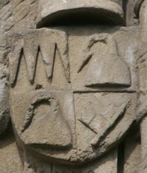 Über der Stiftungsinschrift ist dieser Stein von 1438 mit vier um einen zentralen Schildhalterengel angeordneten Wappenschilden streng hierarisch aufgebaut: Ganz oben sehen wir das Wappen des wichtigsten Mannes im damaligen Weltbild, das von Papst Eugen IV., mit richtigem Namen Gabriele Gondulmer (Condulmaro), in Venedig 1383 geboren, ein Neffe von Papst Gregor XII; er trat in den Augustinerorden ein, wurde 1407 Bischof von Siena, dann 1408-1411 Kardinalpriester von San Clemente (Basilica San Clemente al Laterano), 1431 schließlich Papst, gest. 23.2.1447. Das war der Papst, der insgesamt fünf Kreuzzüge gegen die Hussiten führte und alle haushoch verlor. Wenn wir genau hinsehen, war es im Jahre der Datierung dieses Steines (1438) aber nicht gut um den Papst und seine Stellung bestellt: 1434 mußte er aus Rom fliehen, als Mönch verkleidet verließ er die Stadt und ging für neun Jahre ins Exil nach Florenz. Sein Rom ließ er vom Condottiere Giovanni Vitelleschi verwalten (mehr die Schreckensherrschaft eines ehemaligen Söldnerführers als eine Verwaltung), den er 1347 zum Kardinal gemacht hatte, und der jetzt in Rom "aufräumte". Wie auch immer, diese Geschehnisse waren hier in Haßfurt weit weg, und man schuldete ihm immer noch den Respekt als wichtigstem Fixpunkt im feudalen System. Sein Schild zeigt in Blau einen silbernen Schrägbalken (Schrägrechtsbalken). Über dem Schild zwei schräggekreuzte Petrusschlüssel, darüber die spitz-dreieckige Tiara mit ihren drei Kronen, von zwei fliegenden Engeln gehalten.