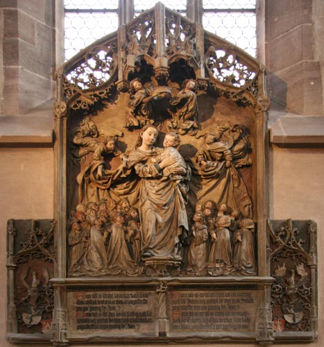 An der Nordwand des Hauptraumes der Frauenkirche befindet sich mit dem Peringsdörffer-Epitaph ein bedeutendes Kunstwerk der Spätgotik, um 1498 vom Bildhauer Adam Kraft geschaffen. Es ist hier nicht am Orte seiner originalen Aufstellung, denn diese Gedächtnistafel wurde von der Familie Peringsdörffer für die ehemalige Augustinerkirche gestiftet. Nach deren Abriß im Jahre 1816 wurde das Epitaphium hierher verbracht. Vom Typ her ist es eine Schutzmantelmadonna, in der Mitte Maria mit dem Kinde unter einer von zwei Engeln getragenen schwebenden Krone, weitere Engel spannen den Mantel weit auf als symbolischen Schutz für die Menschheit, links befindet sich im Schutze des Mantels eine bunte Mischung aus geistlichen und weltlichen Würdenträgern und Bürgern, rechts in gleicher Weise beschützt die Mitglieder der Stifterfamilie. Das Epitaph wurde gestiftet von Sebald Peringsdörffer, gestorben 1498.