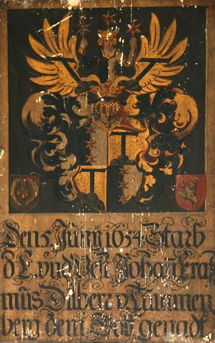 Abb. links: Totenschild für Mang Dilherr von Thumenberg. Die Inschrift lautet: "Anno 1683 den 6. Octobris verschied in Gott der Edel Gestreng und Mannvest Mang Dilherr von Thumenberg, des Hochlöbl. Fränckischen Crayßes Regiments zu Fuß und hiesiger Freyen Reichsstatt wohlbestelter Hauptmann, im Feldläger wieder den Erbfeind beij Preßburg, Deme Gott eine frölige Aufferdtehung verleyhen wolle." Das vermehrte Wappen ist geviert, Feld 1 und 4: schwarz-silbern gespalten mit drei goldenen sechsstrahligen Sternen auf der Spaltlinie (Stammwappen), Feld 2 und 3: in Gold auf einem grünen Dreiberg der schwarze lateinische Buchstabe "T". Auf dem gekrönten Helm mit rechts schwarz-silbernen und links schwarz-goldenen Decken wächst eine gekrönte Jungfrau in schwarz-silbern gespaltenem Gewand, in den beiden Händen je einen goldenen Stern haltend, auf der goldenen Krone ein dritter Stern, zwischen einem goldenen, beiderseits mit einem schwarzen lateinischen Buchstaben "T" auf einem grünen Dreiberg bezeichnet. Ein Beischild für die Ehefrau ist zu sehen, in silbern-blau geteiltem Schild aus einem goldenen Dreiberg wachsend ein Rosenstrauch mit drei roten Rosen an grünen, beblätterten Stielen (Hinweise willkommen).