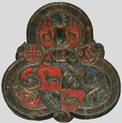 Ein weiterer Totenschild für ein Mitglied der Familie Löffelholz, diesmal ohne zuordnende Inschrift und auch undatiert. Das in einen Dreipaß einbeschriebene Wappen folgt der obigen Beschreibung, allerdings sind beide Kleinode zu einer Kombinationshelmzier vereinigt worden auf einem einzigen Helm. Lediglich zwei Details erlauben Rückschlüsse auf den Betreffenden: In den oberen beiden Ecken des Dreipasses sind zwei runde Scheiben aufgelegt mit den Symbolen für die Mitgliedschaft in ritterlichen Orden, links das Ordenszeichen der Ritter vom Hl. Grab, ein rotes Krückenkreuz, welches von vier kleinen roten griechischen Kreuzen bewinkelt ist, das am höchsten angesehene Abzeichen, das man nach dem Besuch des Heiligen Grabes erwerben konnte, rechts das außen mit silbernen Messerklingen besetzte Rad mit durchgesteckter Kurbelachse für den St. Katharinen-Orden der Pilger zum Katharinenkloster auf dem Sinai. Dies zeigt, daß der Betreffende die Pilgerfahrt ins Heilige Land vollzogen hat. Dafür kommen z. B. zwei Brüder in Frage, Thomas und Christoph Löffelholz, die sich 1498 dem Zuge anschlossen, welchen Herzog Heinrich von Sachsen frommer Sitte gemäß nach dem heiligen Lande unternahm. Beide Brüder kehrten als Ritter vom heiligen Grabe und des St. Katharinenordens zurück. Weitere Hinweise willkommen.