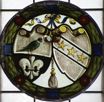 Abb. links: Das undatierte Medaillon zeigt ein Allianzwappen aus dem Wappen der Paumgartner (silbern-schwarz geteilt, oben grüner Sittich, hier gewendet, unten eine silberne Lilie) und dem der Dichtel (Tichtel). Das Wappen der Dichtel zeigt in silbernem Schild einen eigentlich korrekterweise blauen, hier abweichend ebenfalls silbernen, mit drei goldenen, hier nur fünfstrahligen Sternen belegten Schrägbalken (Schöler Tafel 34). Das hier nicht abgebildete Oberwappen wäre zu blau-silbernen Decken ein wachsender silberner Mannesrumpf mit silbernem Hut, dessen blauer Stulp mit den drei goldenen Sternen belegt ist, oben gekrönt und mit blauen und silbernen Federn besteckt (Siebmacher Band: BayA1 Seite: 10 Tafel: 8). Diese 1647 erloschene Familie, Bürger von Nürnberg, gehörte zum Münchner Patriziat. Später wurde das Wappen mit dem der 1518 ausgestorbenen Marschalk von Stumpfberg geviert und der Name erweitert zu Dichtel von Tutzing, wo sie zu Tutzing am Wurmsee und zu Fuessberg landsässig waren. Diese Kombination paßt zu Hieronymus I. Paumgartner, 1498-1565, der 1526 Sibylla Dichtel geheiratet hatte. Hieronymus war ein Bekannter Luthers und Melanchthons und nahm 1525 an dem vom Nürnberger Rat herbeigeführten Religionsgespräch teil. Beinahe wäre hier ein anderes Wappen zu sehen gewesen: Er sollte sogar erst Katharina von Bora heiraten, die dann aber die Frau Luthers wurde. Stattdessen heiratete Hieronymus Sybilla Dichtel (gest. 1566). Auch diese stammt aus zutiefst der Reformation verbundenem Hause, ihr Vater Bernhard Dichtel wurde 1523 in München wegen seiner religiösen Einstellung noch an Stirn und Wangen gebrandmarkt. Hieronymus wurde Ratsmitglied und leitete das Nürnberger Schul- und Kirchenwesen und vertrat die Stadt in diplomatischen Geschäften. 1544 wurde er vom Raubritter Albrecht von Rosenberg entführt und gefangengesetzt, was zu einer Strafaktion der Nürnberger gegen das Rosenberger Schloß Haltenbergstetten führte. Erst nach 14 Monaten kam Hieronymus frei. Danach machte er weiter im Rat Karriere, wurde 1553 schließlich dritter Oberster Hauptmann, nahm weitere Ämter aber aus gesundheitlichen Gründen nicht mehr an.