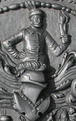 Der optisch linke Beischild zeigt das Wappenbild der Volckamer, von Silber und Blau geteilt, oben ein oberhalbes rotes Rad mit drei Speichen, unten eine silberne Lilie. Das hier nicht dargestellte Oberwappen wäre zu rot-silbernen Decken ein unterhalbes rotes Rad mit drei Speichen, oben mit einem schwarzen Hahnenfederbusch besteckt. Anna Regina Volckamer (1613-1641), Tochter von Georg Christoph Volckamer, war die erste Frau von Wilhelm Bartholomäus Peller (1611-1669). Der optisch rechte Beischild ist gespalten, rechts drei (2:1) hersehende Ochsenköpfe, links neun (3:3:3) Blumen. Das ist das Wappen der von Oyrl, denn Maria Magdalena von Oyrl (16191686) heiratete 1642 als dessen zweite Frau Wilhelm Bartholomäus Peller, den Sohn von Martin Peller (1559-1629). Tinkturen unbekannt, Hinweise willkommen.