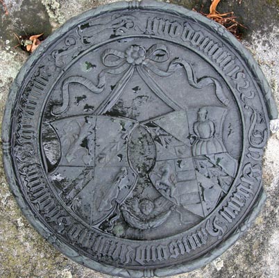 Metallplatte 4: Die kreisförmig umlaufende Inschrift lautet: "Anno 1632 Johann Vollandts Apodeckers Veronica seiner Ehewirthin einer gebornen Speißerin unnd ihrer Erben Begrebnus". Das Wappen Vollandt zeigt in silbern-blau schräggeteiltem Schild einen linksaufspringenden Löwen in verwechselten Farben, auf dem Helm mit blau-silbernen Decken der Löwe wachsend (Siebmacher Band: Bg1 Seite: 32 Tafel: 39). Zwei Beiwappen ergänzen die Komposition.