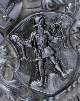 Auf dem bewulsteten Helm der Bock oder Widder wachsend. Das Wappen wird abgebildet bei Schöler auf Tafel 96 (etwas modifiziert), es ist nicht im Siebmacher. Unter der gemeinsam verwendeten Helmzier befindet sich noch der Schild der Ehefrau mit dem Wappenbild der Schwender oder Schwendter, in Silber auf rotem Dreiberg stehend ein in ein rotes Wams gekleideter Mann mit ebensolcher, silbern aufgeschlagener Mütze, in der Rechten einen blauen Fisch haltend, in der Linken eine Weintraube mit grünem Blatt haltend. Das Wappen der aus Regensburg stammenden Familie wird beschrieben bei Schöler auf Tafel 113 sowie im Siebmacher Band: Bg2 Seite: 9 Tafel: 16 und Band: Bg9 Seite: 47 Tafel: 57. Die hier nicht dargestellte Helmzier wäre zu rot-silbernen Decken der Mann aus dem Schild wachsend, nur mit dem Fisch, die Linke eingestemmt.