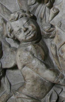 Abb. links: Der linke der beiden schildtragenden Engel, Ausschnittsvergrößerung. Abb. Mitte: Zehntes Wappen der Stammreihe, die linke Spalthälfte des Schildes zeigt das Wappenbild der Schwab, in Rot ein aufspringendes silbernes Einhorn. Die hier nicht dargestellte Helmzier wäre auf rot-silbernem Wulst oder ohne diesen nur zu ebensolchen Decken das silberne Einhorn wachsend (Schöler S. 99, Tafel 107, Siebmacher Band: Bg1 Seite: 55 Tafel: 77, Band: BayA1 Seite: 92 Tafel: 89, Band: BayA3 Seite: 195 Tafel: 141, Wappenbrief von 1529). Johann Jakob I. Tetzel (1595-1646), einziger Sohn Karls und der Erwerber von Artelshofen, hatte 1616 Magdalena Schwab geheiratet. Er wurde 1616 Genannter des Größeren Rates, 1620 Alter Genannter des Kleineren Rates, 1622 jüngerer Bürgermeister, danach Rugherr, Landpfleger und Kriegsherr und diente seiner Stadt in zahlreichen diplomatischen Missionen. 1640 wurde er fürstlich württembergischer Rat.