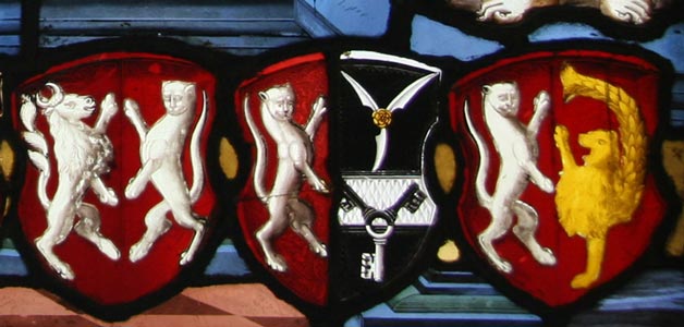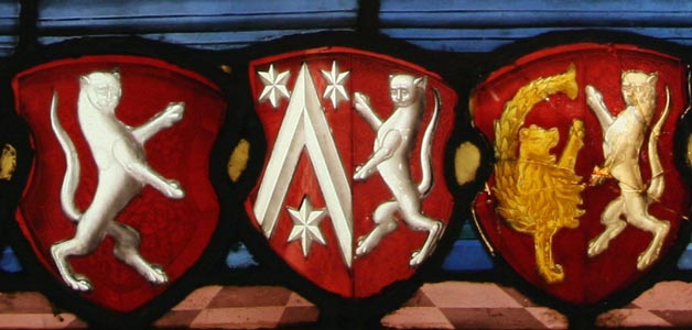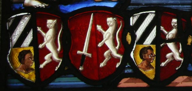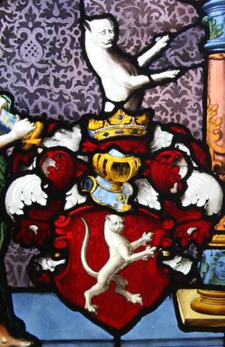 Der siebte Wappenschild von optisch links ist gespalten, heraldisch rechts das Wappenbild der Scheurl (in Rot ein aufspringender silberner Panther (Pantier), gewendet), heraldisch links das der Tetzel. Hier hatte die jüngste Tochter der Familie in die Familie Scheurl eingeheiratet, die Namen sind mir nicht bekannt (Hinweise willkommen).