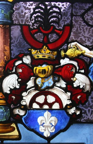 Dieses Fenster besitzt eine Scheinarchitektur aus einem an den beiden Seiten vorspringenden Sockel auf perspektivisch gefliestem Boden und fünf sichtbaren, das Gebälk tragenden Säulen, die der Raumaufteilung dient, um das heraldische Programm schlüssig unterzubringen. Die mittlere Säule wird von zwei Vollwappen flankiert, vor den äußeren Säulenpaaren (die vorderen rosa mit hellblauem Kapitell, die perspektivisch hinteren grün-rot) stehen zwei allegorische Figuren, und der Sockel dient der Aufreihung von insgesamt neun Wappenschilden ohne Oberwappen. Die Logik ist schlüssig: Die Erwachsenen-Generation bekommt Vollwappen, die Kinder-Generation nur Wappenschilde. Ist ein Kind verheiratet, wird der Schild gespalten, wobei immer das Wappenbild des Ehemannes heraldisch rechts und das der Ehefrau heraldisch links erscheint. Somit handelt es sich überall dort, wo die Katze optisch rechts ist, um Töchter - hier sechs an der Zahl, und im gegenteiligen Fall um Söhne, hier zwei an der Zahl. Unverheiratete Kinder, sei es, daß sie noch zu jung sind oder früh verstorben sind, bekommen den väterlichen Schild alleine, dieser Fall tritt hier einmal auf. Ist ein Sohn mehrfach verheiratet gewesen, so wird die Spalthälfte für die Ehefrau(en) noch einmal geteilt, so daß nun drei Wappenbilder in einem Schild vereinigt werden. Dies ist einmal der Fall, im zweiten Schild von optisch rechts. Und die Figuren werden stets gewendet, in einem gespaltenen Schild ist die Bezugslinie die Mittelspaltung, bei nicht unterteilten Schilden ist die Bezugslinie die Mittellinie des Fensters. Nicht nur, daß es prinzipiell bei jeder Komposition einfach besser und geschlossener aussieht, wenn die dargestellten Lebewesen oder Personen ins Bild hineinschauen und nicht zum Rand, sondern es entspricht auch der heraldischen Courtoisie, daß sich Ehewappen gegenseitig anblicken, wie man hier sowohl bei den beiden Vollwappen als auch bei sieben der neun Schilde sehen kann. Der Schild, der nur das Tetzelwappen alleine zeigt, ist gewendet, weil er sich optisch links von der Mittelachse des Glasbildes befindet. Insgesamt neun verschiedene Nürnberger Familien werden durch diese Glasmalerei genealogisch verknüpft.