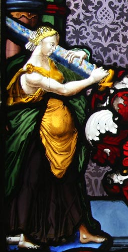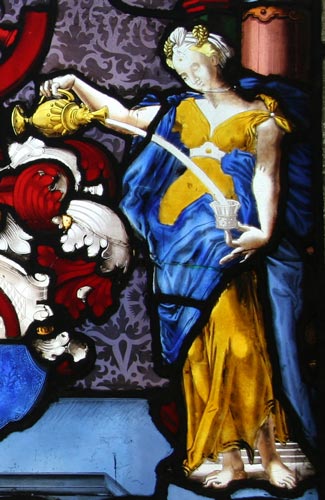 Detailausschnitte mit den allegorischen Darstellungen humanistischer Tugenden, hier rechts die Temperantia - Mäßigung (gießt Wasser aus einem Vorratsbehälter in einen kleinen Glaspokal mit Wein), eine der vier platonischen Kardinaltugenden, und links Fortitudo - Stärke (eine schwere steinerne Säule schulternd).