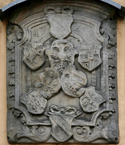 An der Außenfront der Marienkirche Velden befindet sich ein auf 1724 datierter Stein mit insgesamt 9 Wappenschilden. Die drei in der Mitte bilden die klassische Trias Nürnberger Wappen (Farben zugeordnet), oben der goldene Schild des Reiches mit dem schwarzen Doppeladler unter der Kaiserkrone, darunter heraldisch rechts der Schild mit dem Großen Nürnberger Stadtwappen, in Blau ein goldener, gekrönter Königs- oder Jungfrauenadler, heraldisch links der Schild mit dem Kleinen Nürnberger Stadtwappen, gespalten, rechts in Gold ein halber schwarzer Adler am Spalt, links von Rot und Silber fünfmal schräggeteilt. Außenherum die sechs Schilde setzen sich zusammen aus den Wappen der fünf Nürnberger Landpfleger, die ihren Sitz in Nürnberg selbst hatten, und dem des Pflegers vor Ort in Velden. Seit 1504 gehört Velden der Reichsstadt Nürnberg. Ein Landpfleger ist ein besonderer Amtsträger in der Stadt Nürnberg, dem im Auftrag des Rates die Verwaltung des ausgedehnten Landbesitzes und die Aufsicht über alle stadteigenen Ländereien außerhalb der Nürnberger Stadtmauern obliegt. Es waren stets fünf Ratsmitglieder, die mit diesem Amt gemeinsam betraut wurden und gemeinsam das Landpflegeamt bildeten. Ihnen unterstanden die vor Ort eingesetzten Pfleger und Kastner und sonstigen Verwaltungsangestellten.