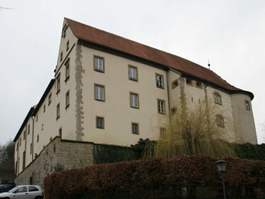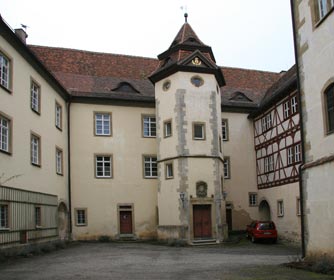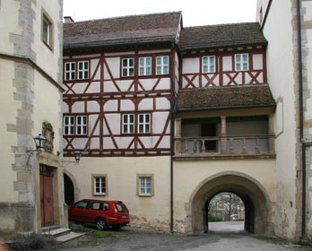 Schloß Haltenbergstetten liegt hoch über dem Ort Niederstetten und dem Tal der Vorbach auf einer Bergzunge. Durch seine Lage ist die heutige, dreigeschossige Vierflügelanlage auf schiefrechteckigem Grundriß schon von weitem sichtbar und dominiert das Ortsbild. Was wir heute sehen, entstammt stilistisch weitgehend der Spätgotik und der Frührenaissance, denn die mittelalterliche Burg wurde 15501572 zum Schloß ausgebaut mit weiteren Umbauten 1641. Nur ein einziger Baukörper ist jünger, fügt sich aber unauffällig in das unregelmäßige Viereck ein, das ist die 1749-1750 im südlichen Teil des Ostflügels eingebaute barocke Schloßkirche mit Rokoko-Ausstattung und Fürstenloge. Etwas abgesetzt am Hang jenseits der Straße befindet sich mit dem Prinzessinnenhaus ein anmutiger Winkelbau mit Mansarddach aus der Zeit um 1800.