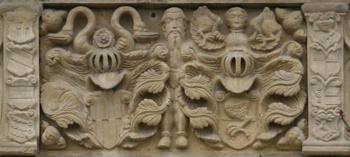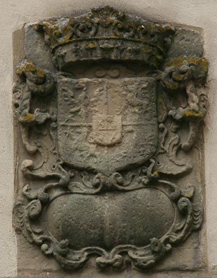 Unter dem dritten Wappenstein am hofseitigen Treppenturm befindet sich die Inschrift: 1550 ERBAUET = ERNEUERT 1824. Dieses stark verwitterte Wappen stammt aber aus der Hatzfeld-Zeit, das Wappen hat einen gevierten Hauptschild, Feld 1 und 4: in Gold ein schwarzer Adler, eigentlich belegt mit einer liegenden silbernen Mondsichel, in der Höhlung mit einem silbernen Kreuzchen besteckt (Schlesien für die Herrschaft Trachenberg in Schlesien), Feld 2 und 3: in Blau ein silberner, goldengekrönter Löwe, aus der Krone drei Straußenfedern hervorkommend (Gleichen), und einen gevierten Herzschild, Feld 1 und 4: in Gold ein schwarzer Maueranker (Doppelhafte, Stammwappen Hatzfeld), Feld 2 und 3: in Silber drei (2:1) rote Rosen (Mispelblüten, Wildenberg). In dieser Form ist das das Wappen der Hatzfeld-Gleichen-Trachenberg.