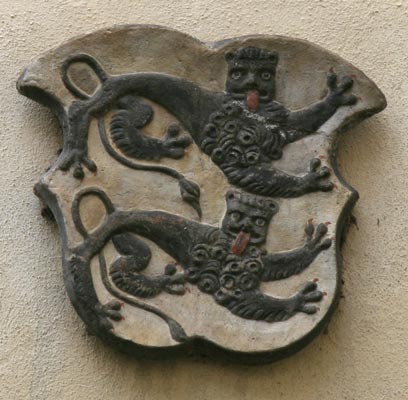Im Hof befinden sich drei Wappensteine. Abb. links: An einer Mauer ist der gewendete Stammschild Hohenlohe-Brauneck angebracht, in Silber zwei rotgezungte, schwarze Leoparden (schreitende, hersehende Löwen) mit untergeschlagenen Schwänzen übereinander. Abb. rechts: Vermehrtes Wappen Hohenlohe, Hauptschild geviert, Felder 1 und 4: Stammwappen Hohenlohe, in Silber einwärts zwei rotgezungte, schwarze Leoparden (schreitende, hersehende Löwen), Felder 2 und 3: Langenburg, geteilt, oben in Schwarz ein einwärts schreitender, goldener, hier hersehender Löwe, rot gezungt, golden gekrönt, unten gold-schwarz gerautet, Herzschild: Grafschaft Gleichen, in Blau ein silberner, Löwe, golden gekrönt.