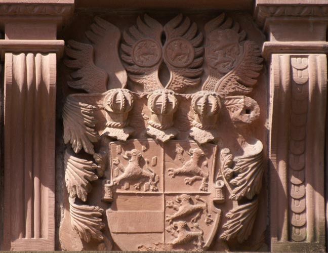 Eine Kuriosität: Beide Ehepartner dieser Wappenkombination haben Katzenelnbogen im Wappen, beide haben Diez! So treffen sich die Ansprüche der Vorväter auf die gleichen Grafschaften, um die sich der sog. Katzenelnbogener Erbfolgestreit entwickelte, hier vereint wieder.