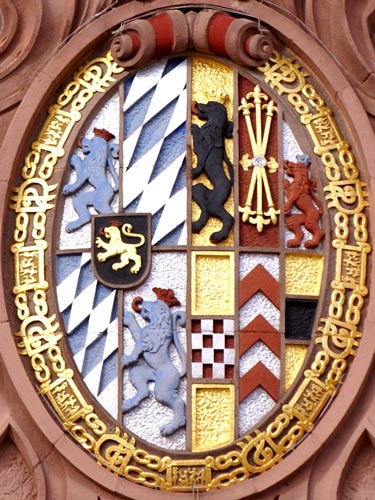 Das in den Segmentbogengiebel gesetzte Wappen in ovaler Kartusche, von einem Ranghut bekrönt und von zahlreichen militärischen Insignien, Kanonen, Trophäen, Feldzeichen, Fässern, Kanonenkugeln, Trommeln, Fahnen, Hellebarden und zwei Götterfiguren umgeben, gehört zu Gustav Samuel Leopold Pfalzgraf bei Rhein zu Zweibrücken-Kleeburg, Herzog v. Bayern (12.4.1670 - 17.9.1731), dem Bauherrn des Schlosses von 1720-1725.