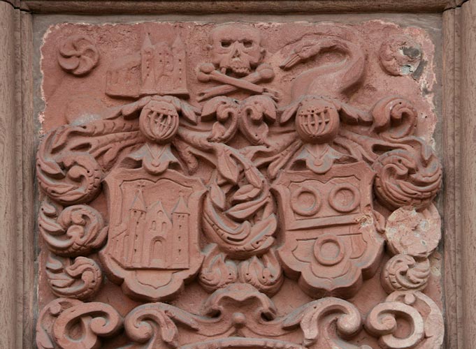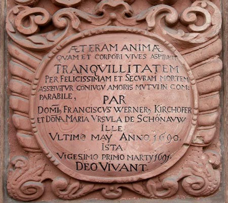 Rings um den Chor des Fridolinsmünsters in Bad Säckingen sind einige alte Grabsteine aufgestellt. Der hier gezeigte Stein erinnert an eines der berühmtesten Liebespaare der Literatur, an den sog. Trompeter von Säckingen. Franz Werner Kirchhofer (1633-31.5.1690), Bürger und Ratsherr der Stadt Säckingen, und Maria Ursula von Schönau (1632-21.3.1691), Tochter des Freiherren Otto Rudolph von Schönau, bilden den historischen Hintergrund für die literarisch unsterblich gewordene Liebe zweier ganz unterschiedlichen Ständen angehörender Menschen, eine Liebe, die alle Standesschranken überwindet, verewigt im 1854 erschienenen "Trompeter von Säckingen" von Josef Victor von Scheffel (1826-1886), übrigens sein Debut und Erstlingswerk. Sogar eine Oper wurde zu dem Stoff gemacht, und die Stadt Bad Säckingen nennt sich heute werbewirksam gerne auch "Trompeterstadt". Das Paar hatte ca. 1657 geheiratet, und ab 1659 bis zu ihrem Tod wohnten die beiden in Bad Säckingen. Franz Werner war ein Kaufmann und betätigte sich zeitweise auch als Schulmeister und Leiter des Knabenchores, und er nahm an der Politik der Stadt Anteil. Gemeinsam hatten sie fünf Kinder. Die Dichtung selbst hat mit der historischen Wahrheit kaum noch etwas zu tun, sondern ist eher eine teils autobiographische Züge tragende Fiktion.