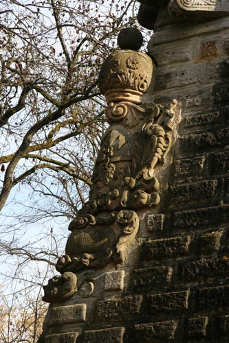 Geht man an der nordwestlichen Face entlang, gelangt man zur Bastionsspitze. Hier ist wie eine Galionsfigur ein Wappenstein des Fürstbischofs Peter Philipp von Dernbach (reg. 1672-1683), genau der gleichen Art, wie man ihn auch im Lapidarium der "Kaiserpfalz" sehen kann. Im Konzept ist er anders als der zuvor vorgestellte Stein, obwohl sie beide auf einer scharfen Ecke sitzen, denn jener kann zwei separate Schilde auf den zwei Seiten der Ecke verteilen, während dieser einen einzigen Schild um die Ecke herumwölbt. Die Inschrift nennt Namen und Titel des Bauherrn und die Jahreszahl 1675. Hier hat es also zwischen Beginn und Fertigstellung der Bastion einen Wechsel des fürstbischöflichen Bauherrn gegeben.
