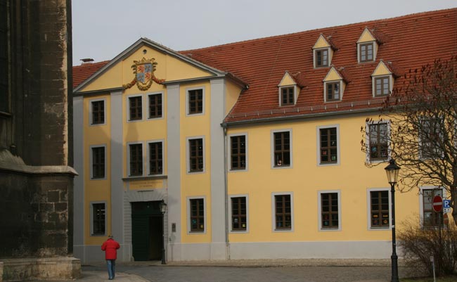 Früher hieß dieses Domherrenhaus einfach "Kurie neben der Kapelle St. Martin" (Curia iuxta capellam Martini). Gegen Ende des 17. Jh. war sie in baufälligem Zustand, so daß sie für Wolfgang Dietrich von Werthern, geb. 10.12.1659, sächsischer Oberhofmeister unter Johann Georg IV., Domherr in Naumburg und Kreishauptmann in Wittenberg, der sie 1700 vom Domkapitel erwarb, im zeitgenössischen Stil wiederhergestellt wurde, mit dem Wappen des Bauherrn im Dreiecksgiebel, wobei dieses mit Fruchtgirlanden geschmückt ist. Die Privilegien der Domfreiheit gingen auf den Käufer über, so daß das Anwesen wie die anderen Kurien ein Freihaus blieb. 1873 erfolgte die nächste Erneuerung, wiederum wegen Baufälligkeit nötig geworden, was die nüchterne Gliederung erklärt, die so gar nicht zu dem barocken Wappen paßt. Der Architekt war Gottfried Alexander Werner, königlicher Baurat. Wo früher Dompröpste residierten, hielten jetzt Ämter und zeitweise auch eine Sparkasse Einzug, bis es zum Schulgebäude wurde.